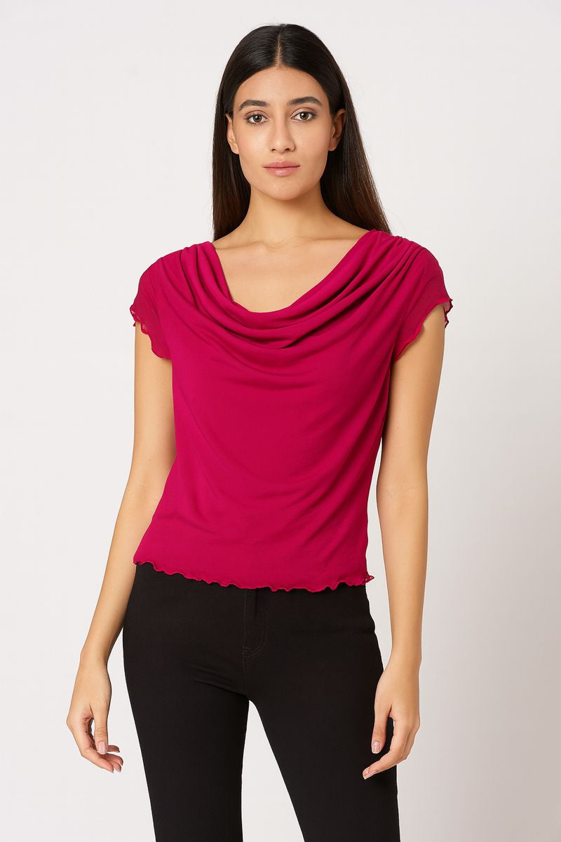 Magenta Cowl Neck Solid Top with Cap Sleeves for Women